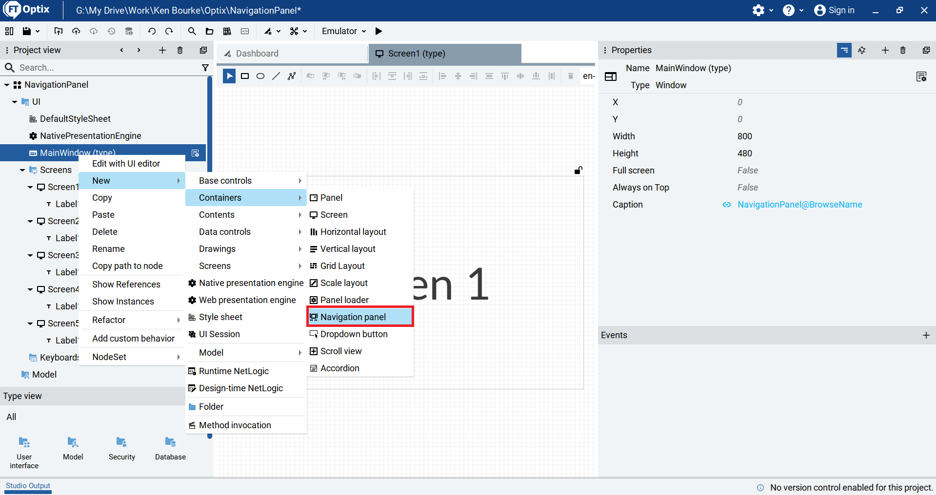 To build my navigation system, I add a Navigation Panel to the MainWindow by right-clicking on the MainWindow and selecting New > Containers > Navigation Panel.