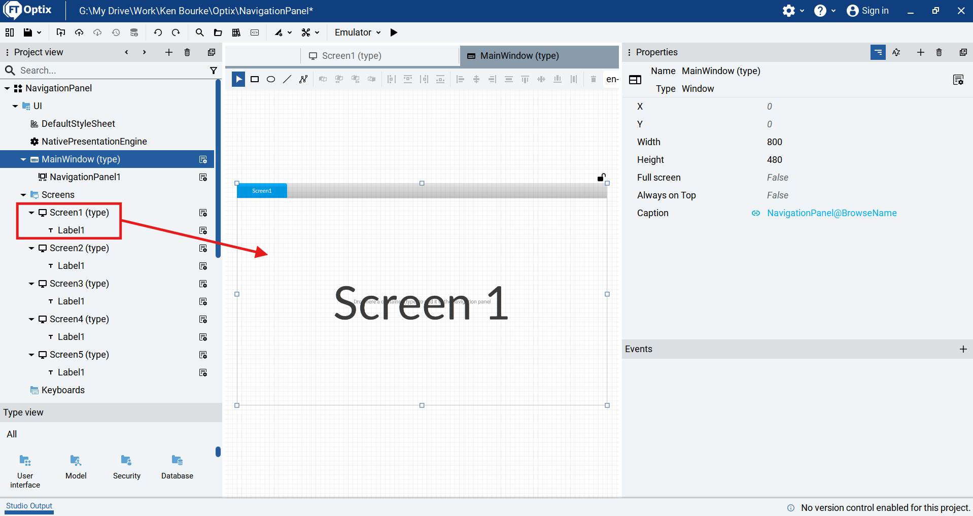 Next, I open the MainWindow and add tabs to the Navigation Panel by dragging screens from the Project View tree and dropping them on the Navigation Panel. Each time I drop a screen on the panel, a new tab is automatically created for that screen.