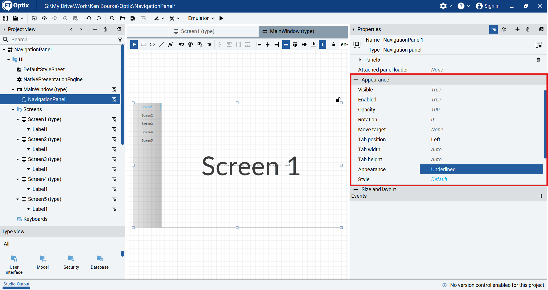 In the properties pane of the Navigation Panel, I customize the way these tabs appear in the Appearance section. Using these properties, I can change the position, style, width, and height of the tabs.