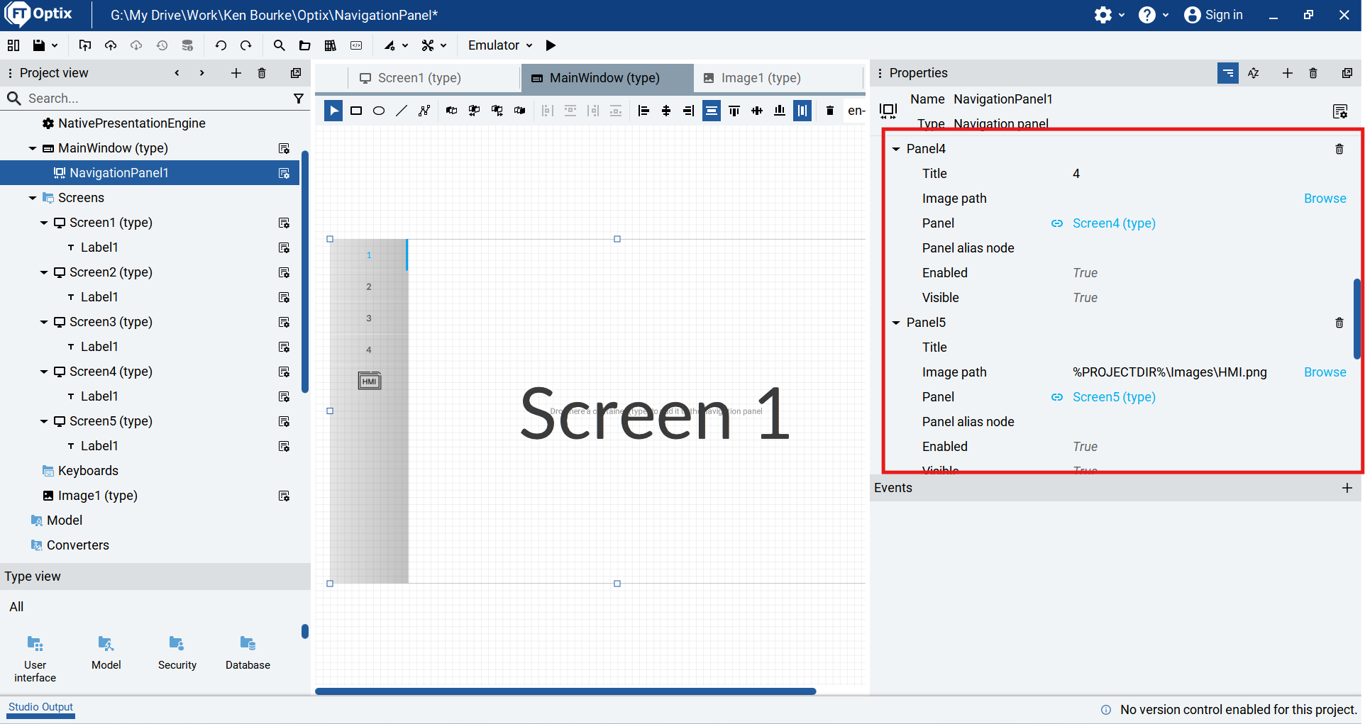 I can also customize the appearance of each tab in the Navigation Panel. Using these properties, I can set a title and image for the tab. If the title and image properties aren’t set, then the screen name is displayed in the tab by default.