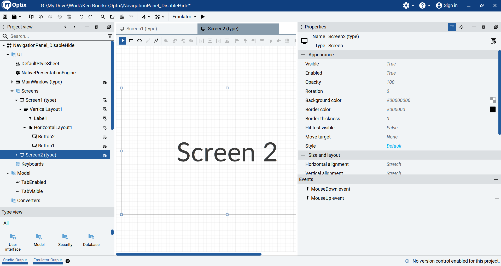 Even though the tab is displayed, I can see that it is greyed out and I can’t click on it to navigate to Screen 2. That’s because the TabEnabled variable is False and the tab is disabled.