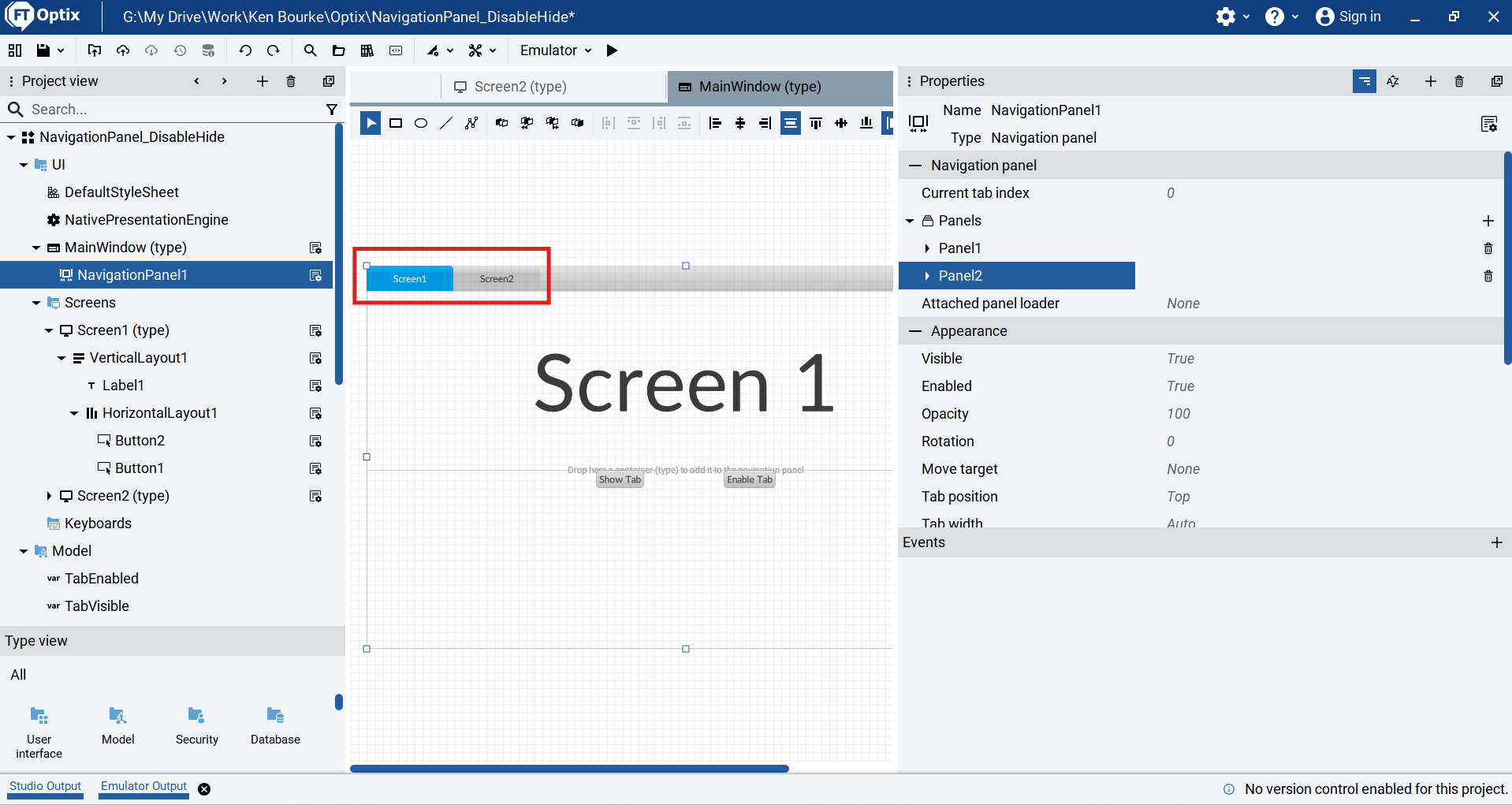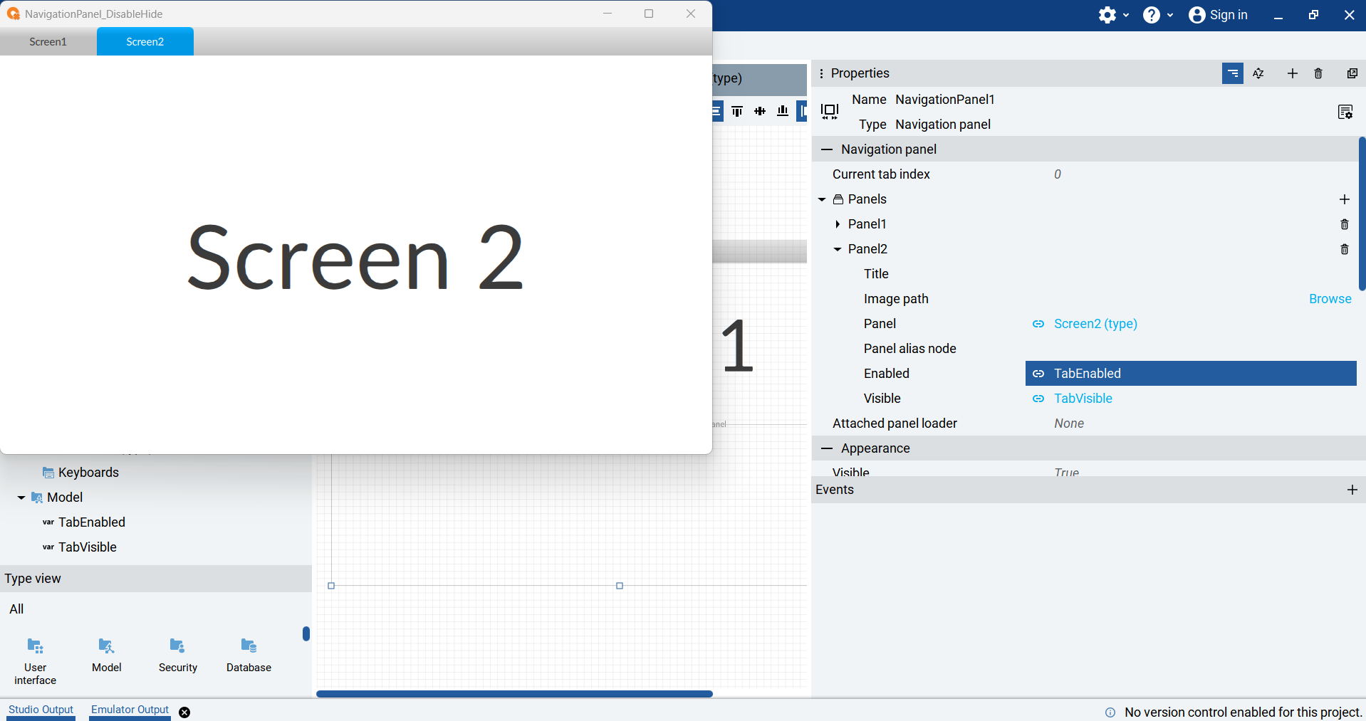 Once the project is set up, I can disable and hide individual tabs in a Navigation Panel by using the Visible and Enabled properties of the panel.