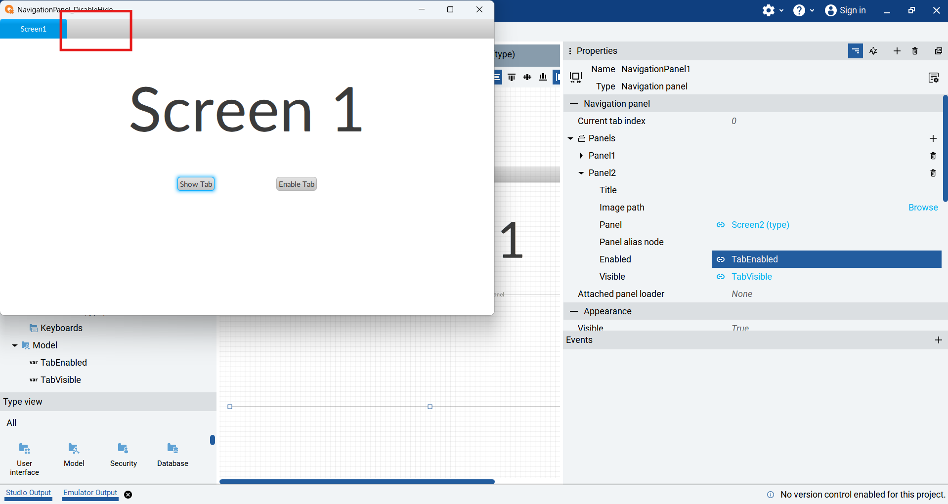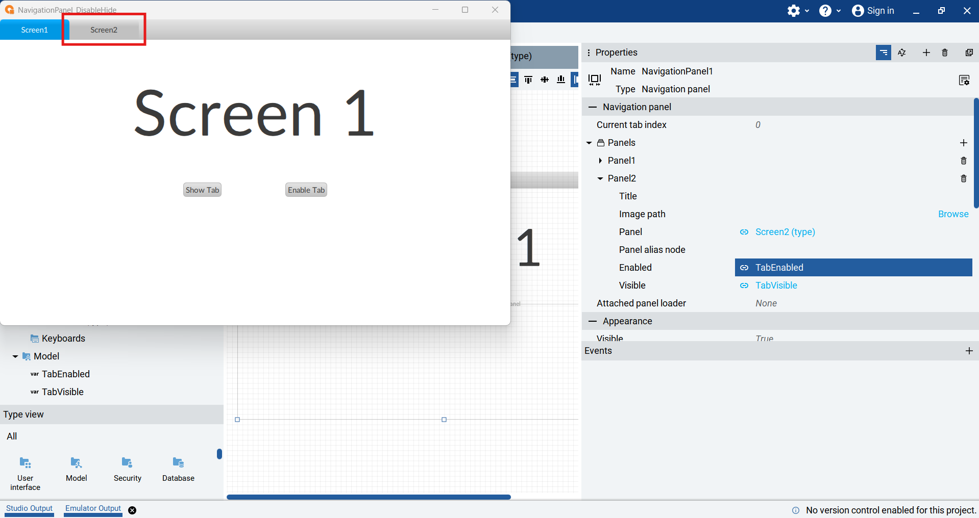 Screen 1 has two buttons that toggle the values of the TabEnabled and TabVisible variables. The variables are toggled using a MouseClick event that triggers the Toggle method.