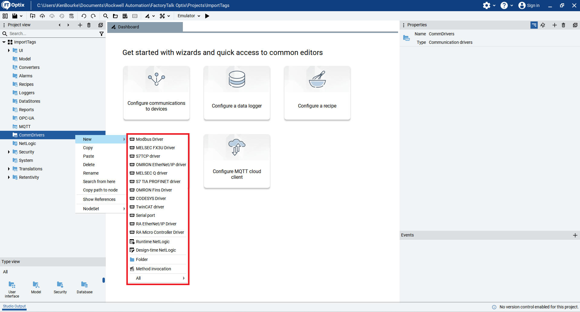A submenu opens with a list of available communication drivers. As you can see from this list, even through FactoryTalk Optix is a Rockwell Automation product, it doesn’t only support EtherNet/Ip communication drivers. You can communicate with almost any type of PLC by using a native communication driver like the RA EtherNet/IP driver or the S7 TIA PROFINET driver or by using the generic Modbus or serial driver.