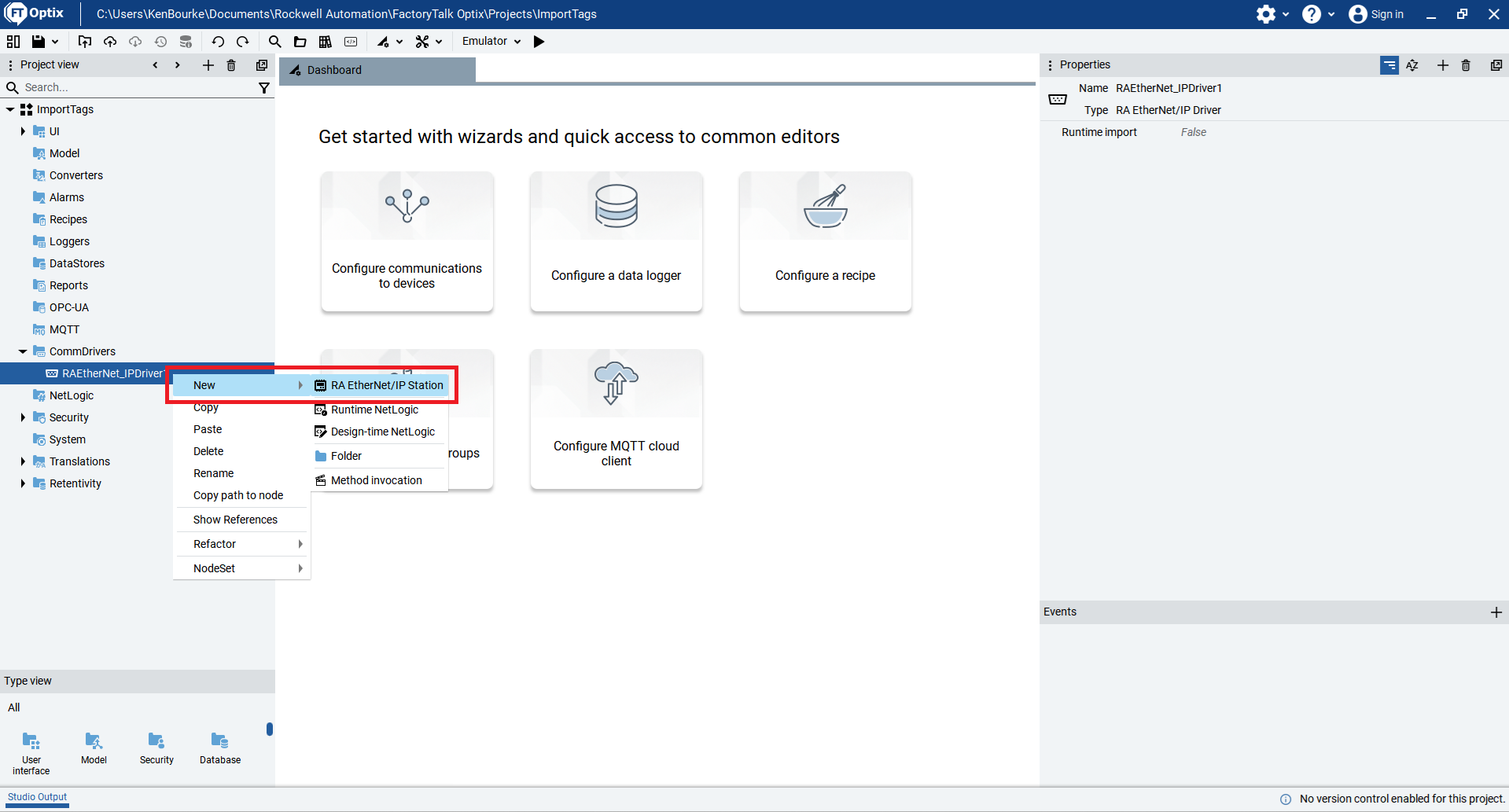To add a communication station, right-click on the communication driver and select New > RA EtherNet/IP Station. The actual text that you see will vary depending on the type of communication driver.