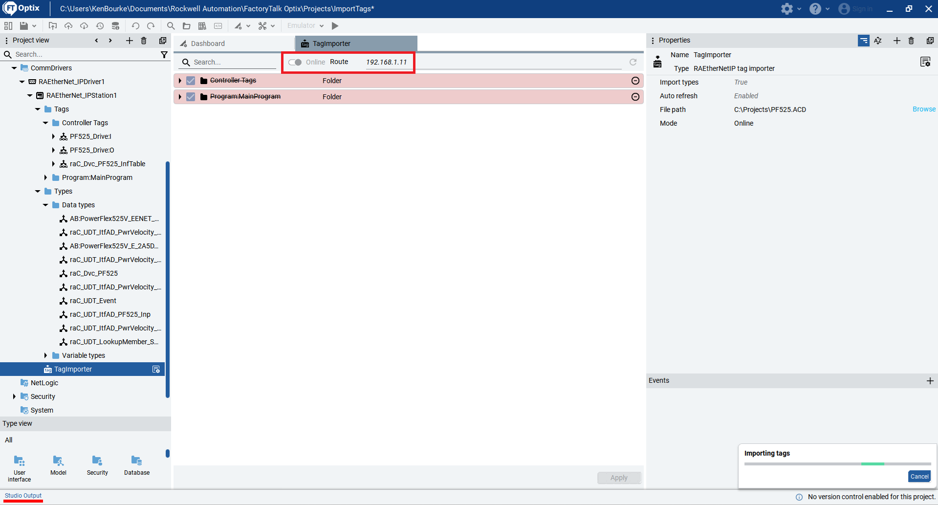 Once you have configured a communication station, you can import tags into your projects offline, which means that the tags are read from a project file, or online, which means that the tags are read from a controller.