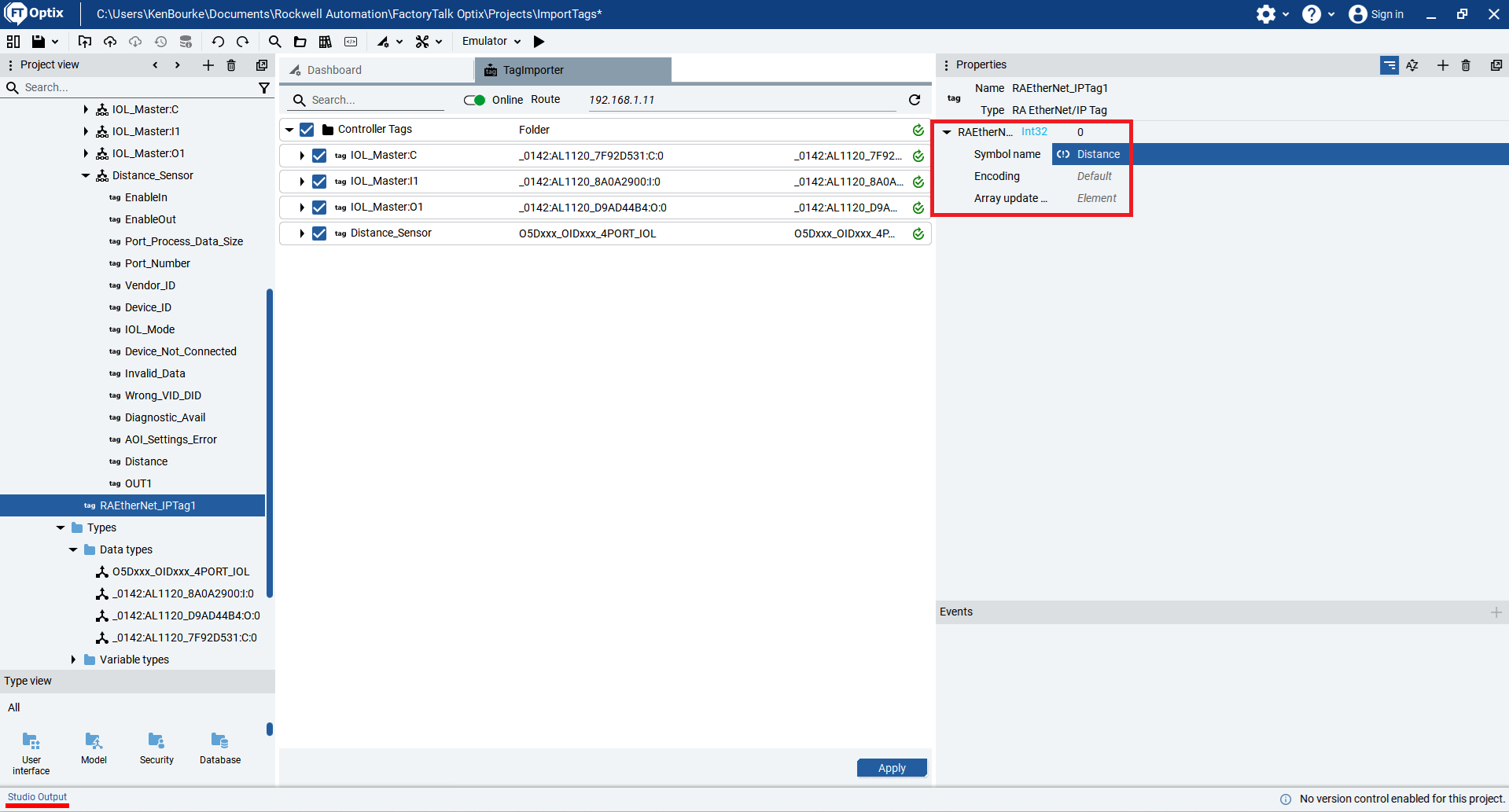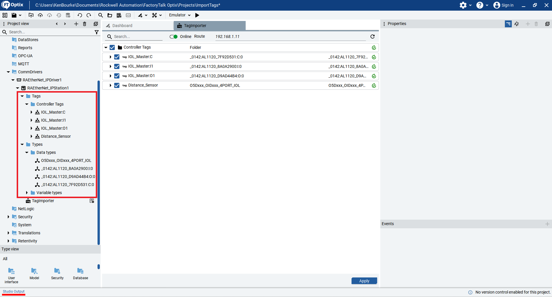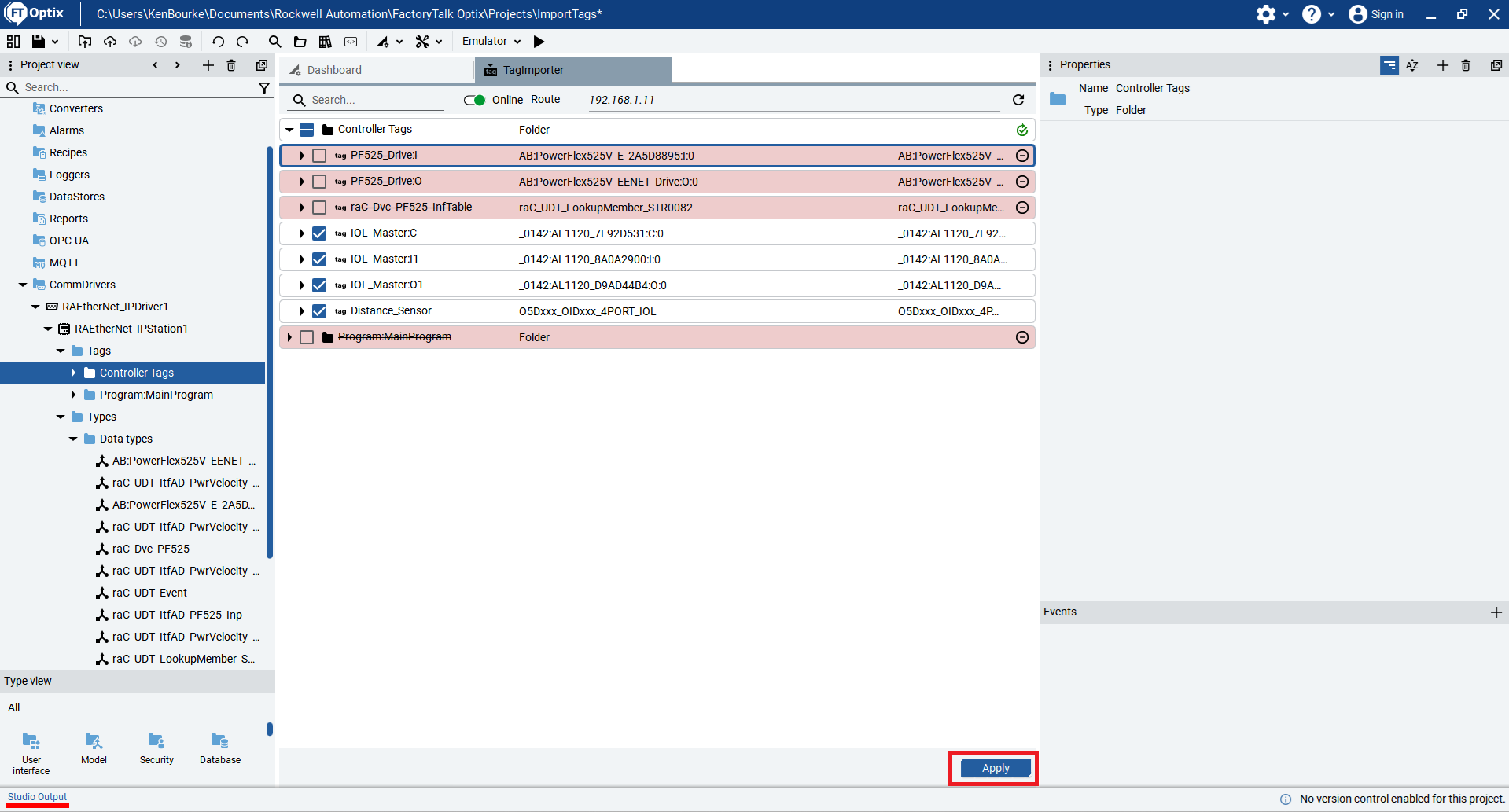 FactoryTalk Optix will read the tags from the controller and list them in the center pane. Once again, you can select the tags that you want to import to the project and click Apply to import the tags.