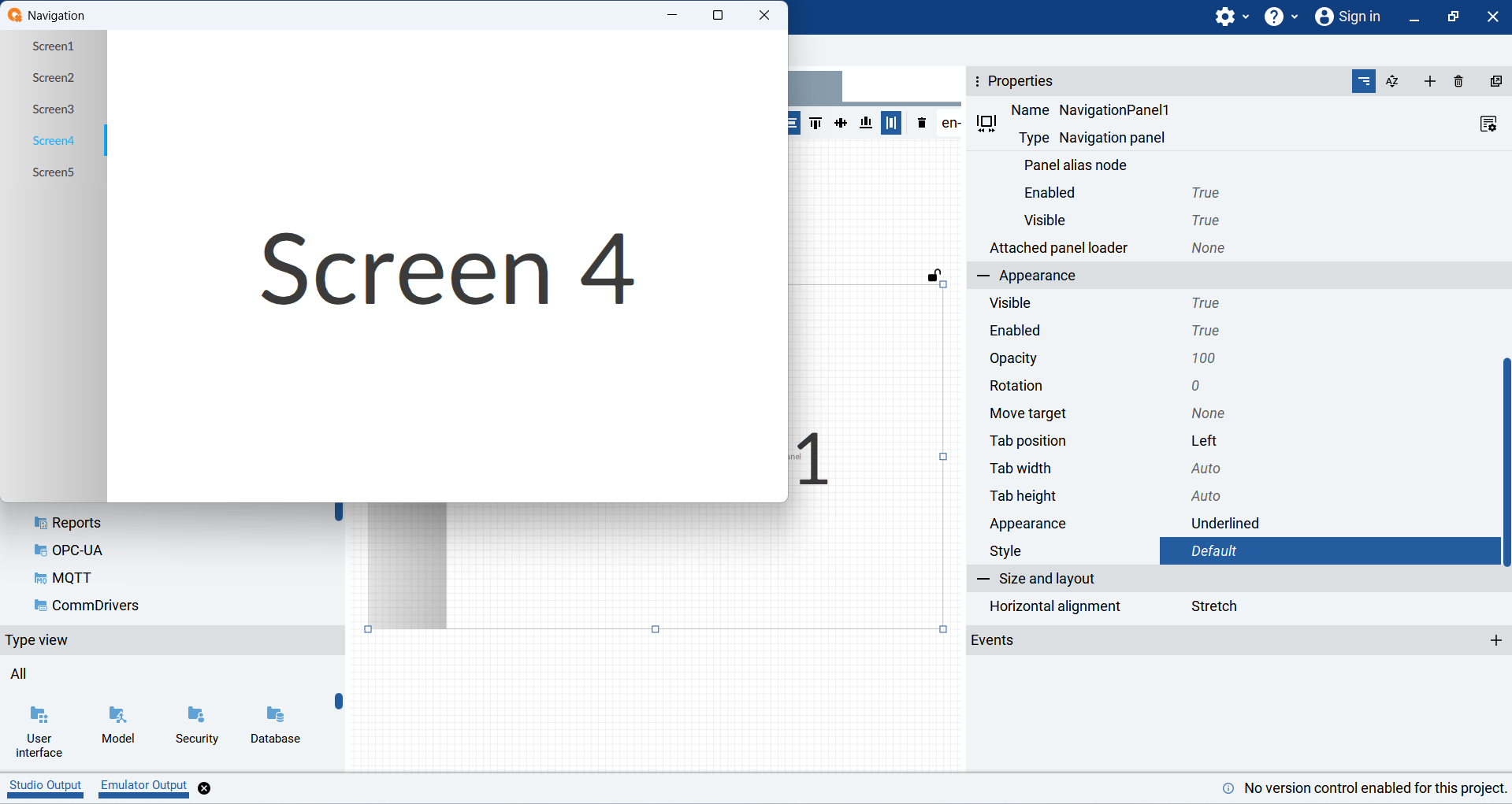 In the properties pane for the Navigation Panel, I can configure properties for each screen including;