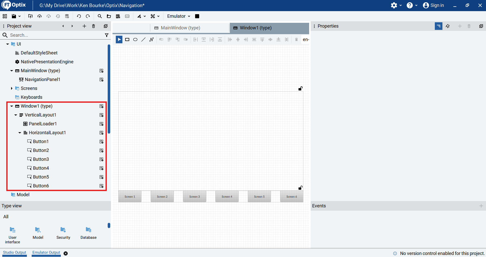 To build the navigation system, I can simply drag screens from the Project View and drop them on the Navigation Panel. As each screen is dropped, a new tab is created for it on the Navigation Panel.