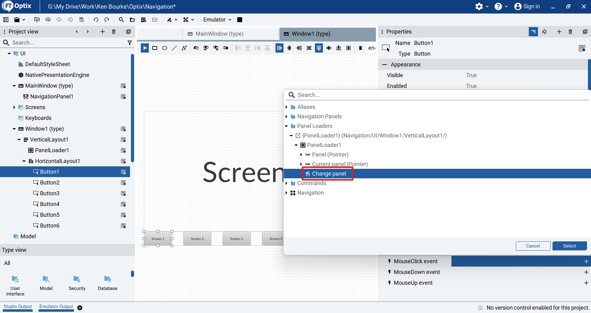 To change the screen being displayed by the Panel Loader, we can use the Change Panel method which is part of the Panel Loader. In this example, I will trigger that method when a Mouse Click event occurs on any of the buttons at the bottom of the screen.
