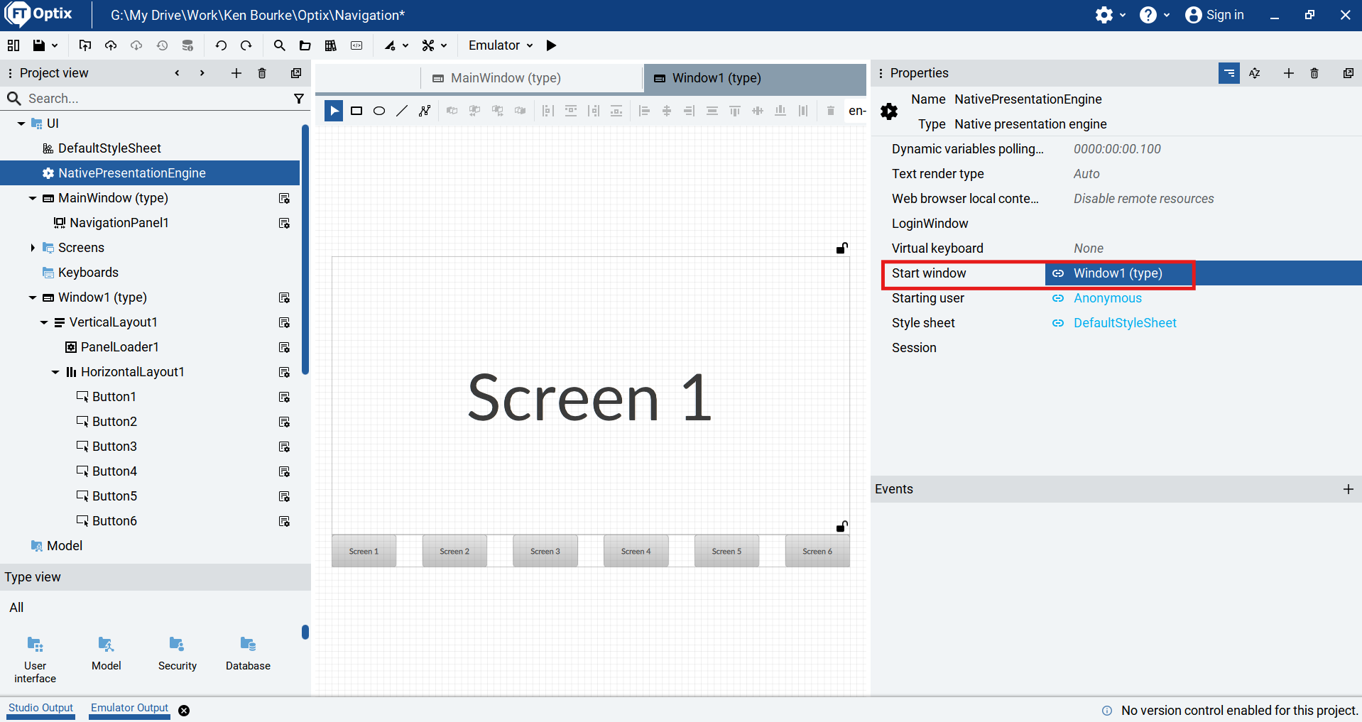 To test the Panel Loader, I set Window1 as the Start Window in the properties of the Native Presentation Engine.